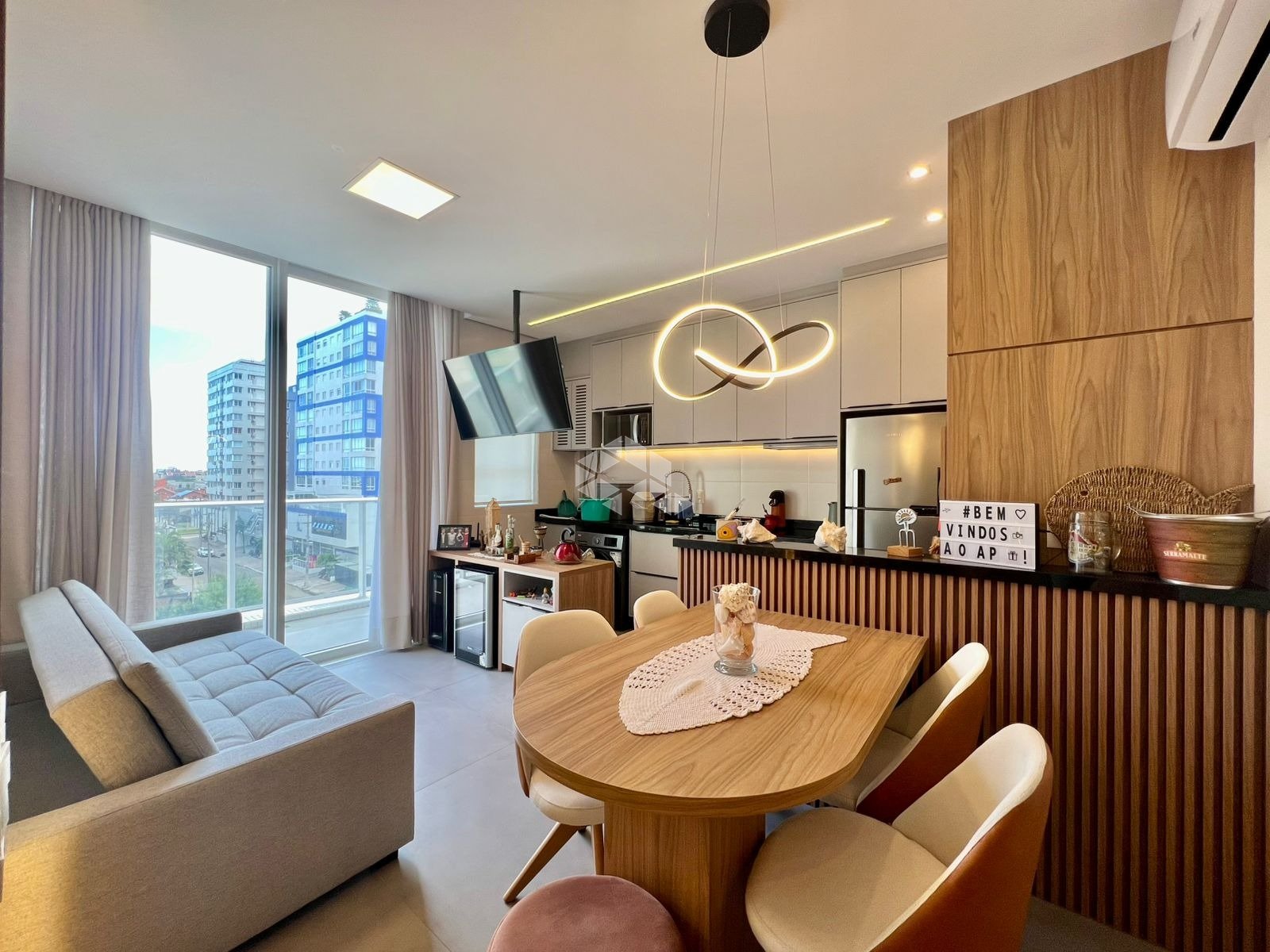 Apartamento de dois dormitórios, sendo uma suíte, totalmente decorado e pronto para morar. O imóvel conta com um excelente living integrado para sala de estar e jantar, proporcionando conforto e praticidade no dia a dia. A cozinha em estilo americano valoriza a integração dos ambientes e dispõe de churrasqueira, ideal para momentos de lazer e confraternização. Possui ainda banheiro social, área de serviço separada, uma vaga de garagem e infraestrutura moderna. O edifício se destaca pela qualidade construtiva, sendo 100% revestido em pastilhas, com hall de entrada decorado que oferece uma recepção elegante aos moradores e visitantes. Conta com dois elevadores, salão de festas para eventos e confraternizações, além de circuito interno de câmeras de segurança e serviço de zeladoria, proporcionando mais conforto, praticidade e segurança no dia a dia. Localizado no bairro Navegantes, uma das regiões mais valorizadas da cidade, o imóvel está próximo à Praça Luterana, à Avenida Ubirajara e aos principais comércios, facilitando o acesso a serviços, lazer e conveniências, tornando-se uma excelente opção tanto para moradia quanto para investimento.